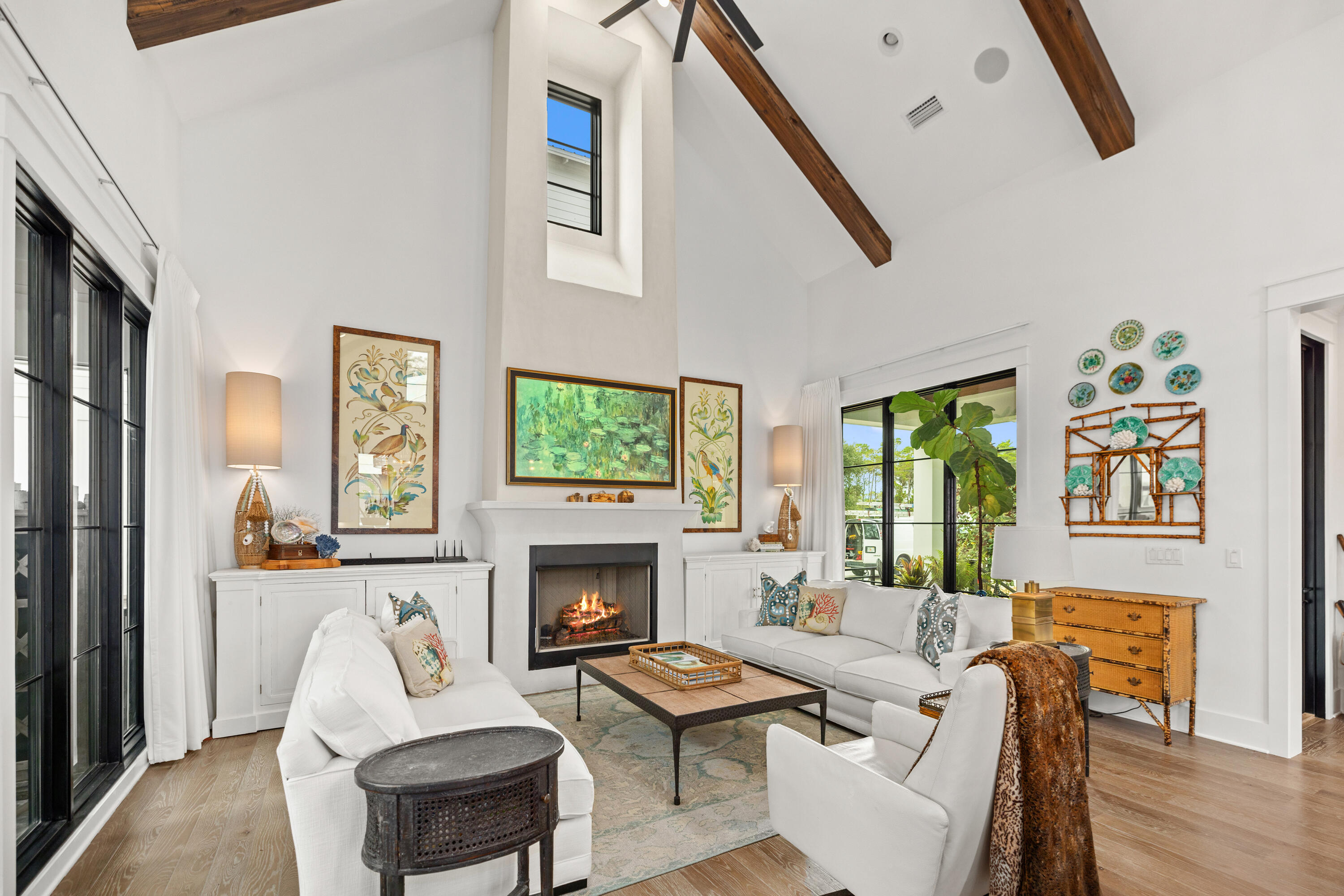 Welcome to 154 Lee Place, a meticulously crafted architectural gem nestled in sought-after Seagrove Beach. This custom-built residence, appraised higher than list price,  and designed by the owner-architect, combines modern luxury with coastal living, offering an unparalleled retreat just moments from the beach, dining, and shopping in this original 30A community. The attention to detail begins the moment you pull into the driveway and are welcomed by an immaculately landscaped front yard, with native trees and vegetation strategically positioned to provide privacy along the home's front entrance. Upon entering, you are greeted by an open and spacious living space where the kitchen, dining, and living areas flow seamlessly together, ideal for entertaining. This shared space is accentuated by vaulted ceilings with exposed cypress beams, and is highlighted by windows prudently placed throughout, showering the interiors with natural light.