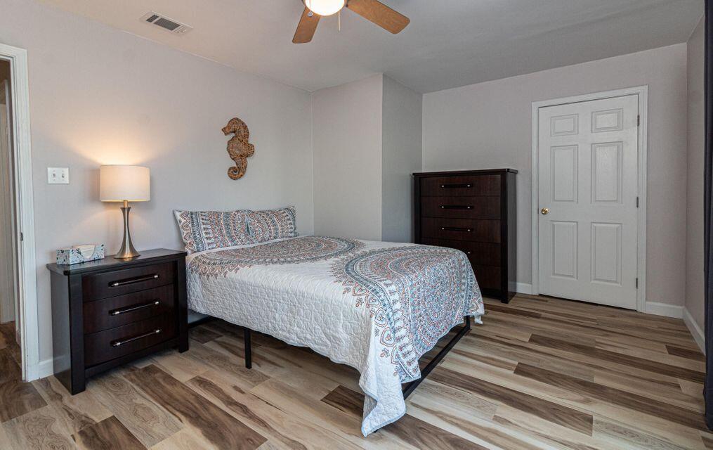 The second floor offers a bedroom with two queen beds and a sitting area.